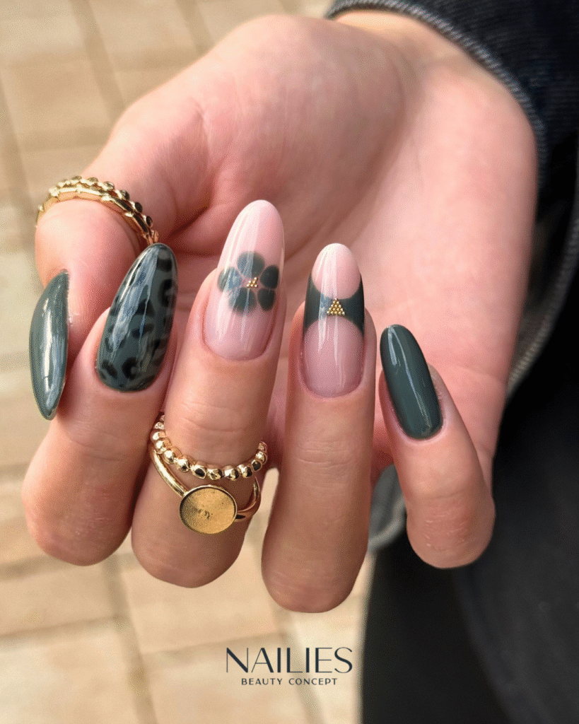Manicure, który łączy w sobie trendy sezonu: głęboką zieleń Algoholic od Indigo, motyw panterki, subtelny kwiatowy akcent oraz geometryczne zdobienie.